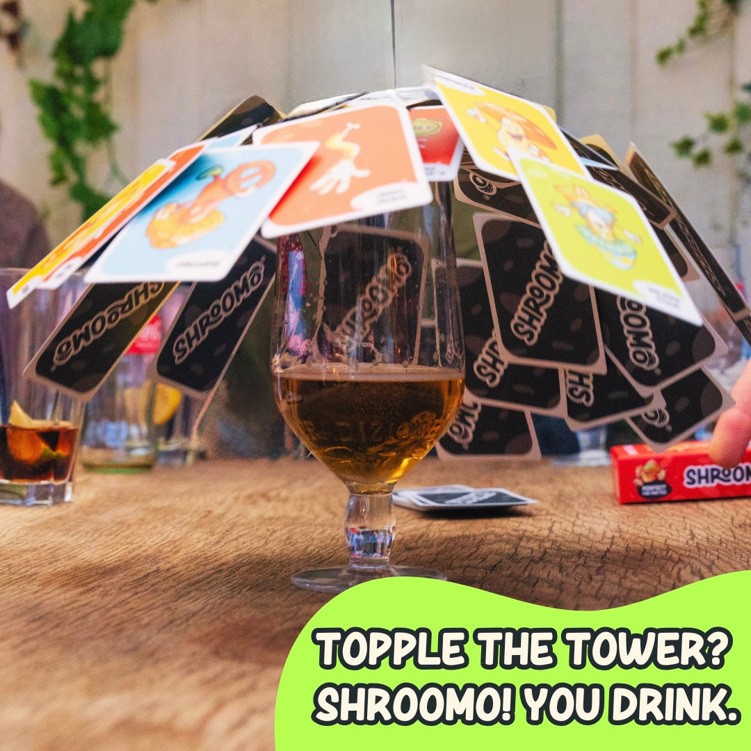 In turns, players balance their card on the rim of a half-filled glass. With each round, the Shroom tower grows taller, wobblier & one step closer to collapse.